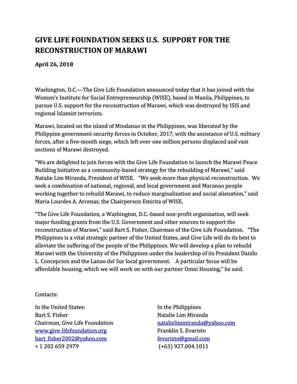 Give Life Foundation Seeks U.S. Support For The Reconstruction Of Marawi